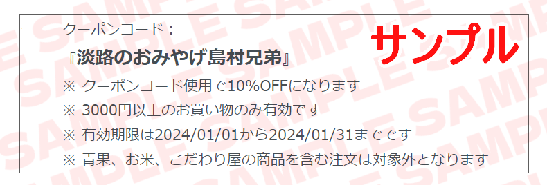 クーポンコードは下記の形で配布されます。 (クーポンコードは例です) ![]() 【ご利用方法】 1. ご注文確定画面で「ショップクーポンを利用する」からクーポンコードをご入力ください。 ![]() 2. 入力後合計金額が変わります。値引きされているかをご確認ください。 ![]() |